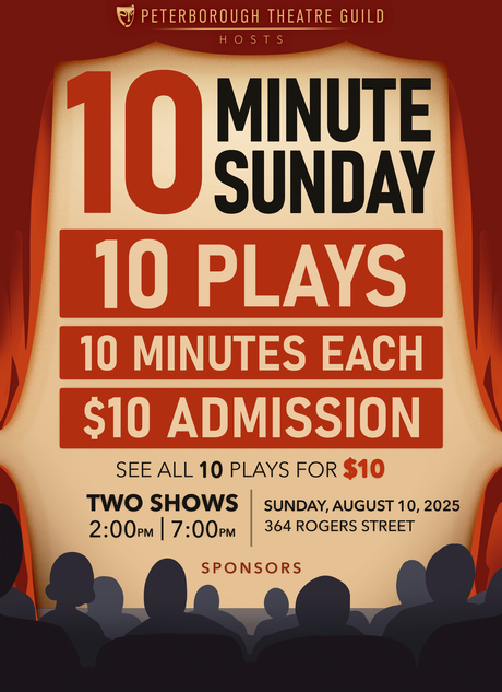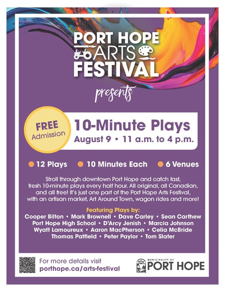 The Ten-Minute Play Festival is back for its fifth season. Part of the Port Hope Arts Festival, this year's version features 12 new plays - 60 performances at six venues. Playwrights are Cooper Bilton; Mark Brownell; Sean Carthew; D'Arcy Jenish; Marcia Johnson; Wyatt Lamoureux; Aaron Macpherson; Celia McBride; Peter Paylor; Samantha Clarke and the Port Hope High School Drama Club; and Tom Slater. Oh, and me...