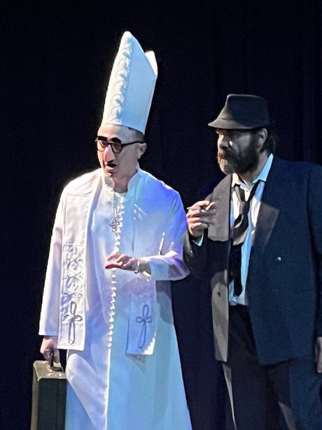 This is a costume to inspire mitre-envy among Bishops everywhere. A scene from the Heartland Theatre production of The Rummage Racket. Jake Marshall is the Bishop; Rick Jensen is Phil the gumshoe. Dave Montague directed and the creative talent behind that towering mitre was Clatie Fischer.